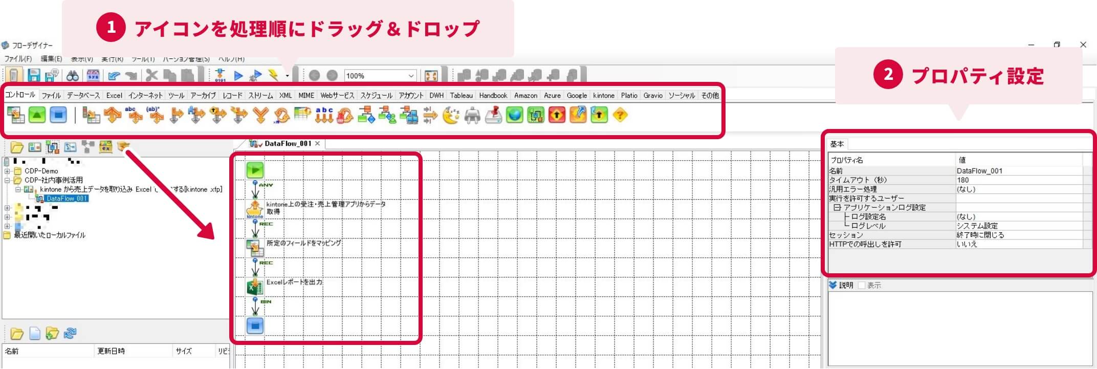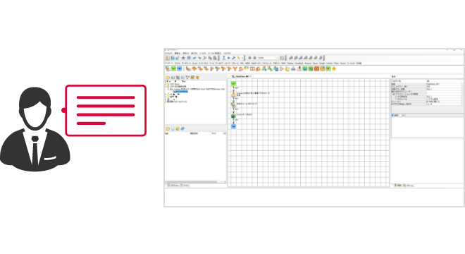 あらかじめ用意されているアイコンをドラッグ&ドロップした後、プロパティ設定するだけで、システム間連携やデータ加工・変換が可能。GUIベースの開発ツールを提供します。