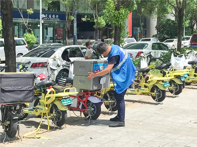 このシステムを支えているのが、電動バイクによる配送サービス(店舗による配送手段のシェアリング)だ。ショッピングモール、コンビニエンスストア、飲食店の前には、店舗から消費者への配送を担う何人ものバイク便ライダーが待機しており、店舗は「倉庫」兼「配送拠点」のようになっている。これにより、買い物や食事をスマートフォンで注文し、配送サービスに届けてもらうことができる。
